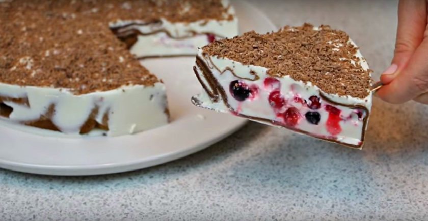 Pripravte si malé sklené misky, do ktorých uložte po jednej palacinke tak, aby sama vytvorila akúsi mištičku, do ktorej budete plniť smotanový krém. Každú palacinku naplňte trochou krému a nasypte niekoľko bobuliek lesného ovocia. Urobte to do všetkých 10-12 palaciniek. Pozor, nechajte si dostatok krému na zaliatie! Potom každú palacinku chyťte ako balíček zvrchu a takto ich naukladajte vedľa seba do maslom vymastenej tortovej formy. Keď sú všetky palacinky naukladané vo forme, zalejte ich zvyšnou smotanou. Tortu dajte stuhnúť do chladničky na 4-6 hodín. Potom koláč už len posypte nastrúhanou tmavou čokoládou a môže sa podávať! Prajeme dobrú chuť!