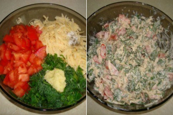 Kým sa pripravuje hlavný chod, nachystajte si šalát. Nakrájajte paradajky, nastrúhajte syr a nasekajte kôpor s petržlenovou vňaťou. Všetko spolu premiešajte a pridajte smotanu, aby bol šalát šťavnatejší. Na záver do šalátu pretlačte cesnak, osoľte ho a okoreňte a dajte zachladiť do chladničky.