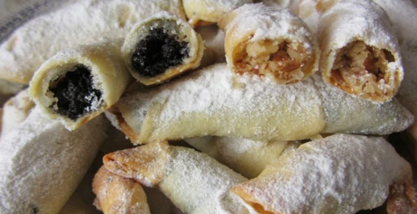 Cesto z chladničky vyvaľkajte na asi 1 mm hrúbku a narežte na trojuholníky. Každý trojuholník naplňte makovou alebo orechovou plnkou. Cesto stačí už len zrolovať.
