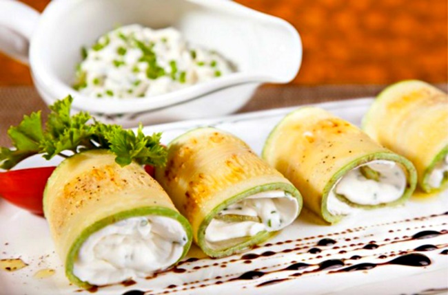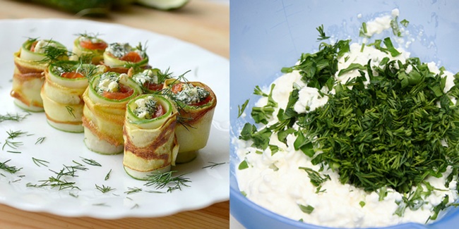 200g mäkkého syra, alebo jemného tvarohu zmiešajte s primeraným množstvom patržlenovej vňate a kôpru. Pretlačte 2 strúčiky cesnaku a pridajte tuhú časť z dvoch paradajok nakrájaných na tenké plátky. Naneste plnku na rozložený pásik cukety a potom zrolujte a postavte. Dozdobte bylinkami a môžete podávať.