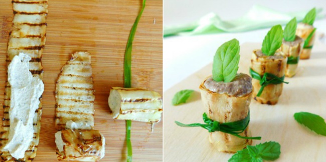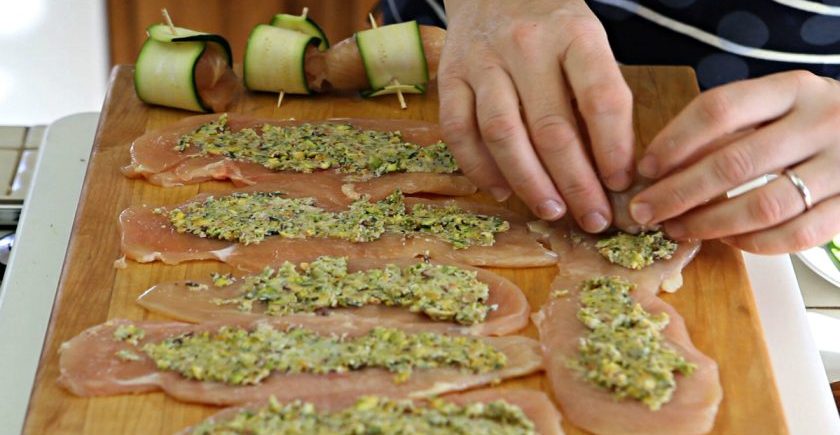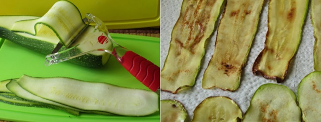 Ak chcete, aby to na tanieri ešte ja pekne vyzeralo, narežte si škrabkou na zemiaky pásiky cukety nie dlhšie ako 15 centimetrov. Tie sa budú akurátne rolovať a pritom nebudú v konečnom výsledku príliš hrubé. Ak máte radi cuketu ogrilovanú, hoďte pásiky na 1-2 minúty na panvicu. Olej ani nemusíte pridávať, aspoň vám ostane cuketa pevná a nebude „spotená“. Ak nechcete cuketu ani surovú, ani ogrilovanú na panvici, môžete ju ešte hodiť na plech a dať na 5 minút do rúry vyhriatej na 180 stupňov. Pre väčšie pohodlie pri servírovaní môžete cukety prepichnúť špajdlou alebo špáradlom, prípadne ich zviazať zelenou cibuľkou.