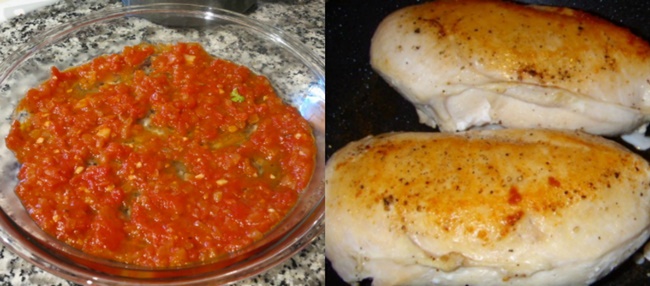 Jeden kus pečených alebo osmažených kuracích pŕs roztrhajte na tenké vlákna, zmiešajte s paradajkovým pretlakom podľa toho, ako máte radi a pretlačte ešte 2 strúčiky cesnaku. Môžete priať trochu soli, korenia a provensálskych byliniek a opäť naplňte vyrolovanú cuketu. Navrch môžete nasypať ešte tvrdý syr.