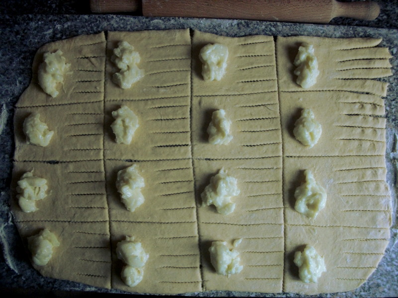 Vezmeme si nakysnuté cesto a vyvaľkáme ho na obdĺžnik približne 25x35cm. Cesto nakrájame tak, aby nám vzniklo približne 16 štvorčekov. Na jednej strane každého štvorčeka urobíme po celej šírke zárezy, viď. foto.