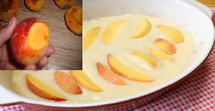 Menší pekáč alebo tortovú formu si vymastite maslom a vysypte múkou  vylejte do nej cesto. Navrch naukladajte mesiačiky broskýň a každú len zľahka zatlačte dovnútra.