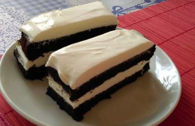 - Upečené cesto si rozdeľte na dve polovice, aby vám vznikli dve vrstvy. Takisto si rozdeľte aj množstvo krému. Naneste ho na prvú vrstvu cesta, opatrne ju prikryte druhou vrstvou cesta a navrch dajte zvyšok krému. Dajte na noc zachladiť a užite si tú jednoduchú chuť!