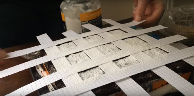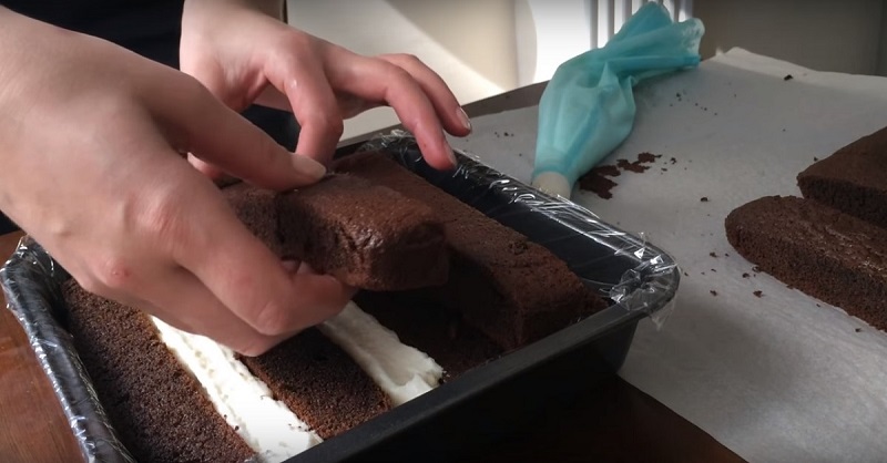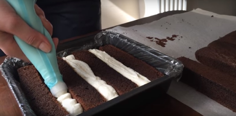 Pásy uložte naspäť do pekáča tak, ako vidíte na obrázku. Medzi ne dajte tvarohový krém. Potom položte druhú vrstvu cesta tentoraz na pásy tvarohu a opäť zvyšok doplňte krémom. Koláč dajte do chladničky a pripravte si čokoládovú glazúru.