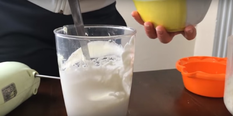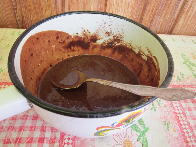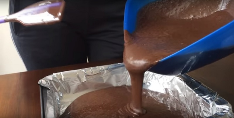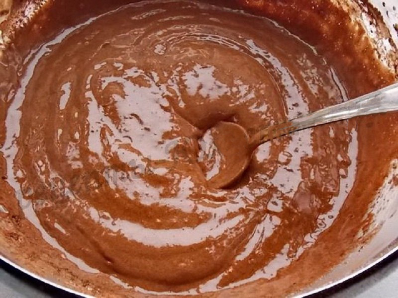 V hrnčeku si zmiešajte mlieko, kakao, cukor a maslo a nechajte ich na miernom ohni rozpustiť. Zmes dôkladne miešajte, aby neprihorela. Keď sa všetko spojí a zmes ostane konzistentná, odstráňte ju z plameňa a nechajte vychladnúť. V miske si zmiešajte múku, prášok do pečiva a celé vajíčka a ručným mixérom vypracuje hustú zmes. Potom pomaly prilievajte vychladnuté mlieko s kakaom a ostatnými ingredienciami.