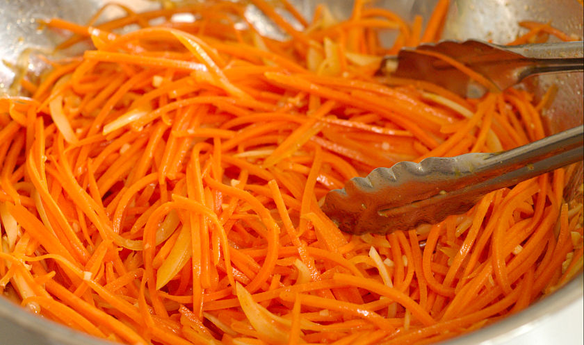 Ako prvé si pripravíme mrkvu na kórejský spôsob. Pokojne si jej môžete pripraviť viac už v predchádzajúci deň a následne ju skladovať v uzatvárateľnej nádobe, keďže sa skvele hodí do akýchkoľvek šalátov a v chladničke vydrží aj niekoľko dní. Mrkvu nastrúhame na tenké pásiky, osolíme a necháme zopár minút postáť. Následne z nej vytlačíme prebytočnú slanú vodu. Pridáme ocot, cukor, čierne korenie, sójovú omáčku a prelisovaný cesnak. Premiešame s rastlinným olejom a pridáme štipku pálivej papriky. Mrkva na kórejský spôsob je hotová!
