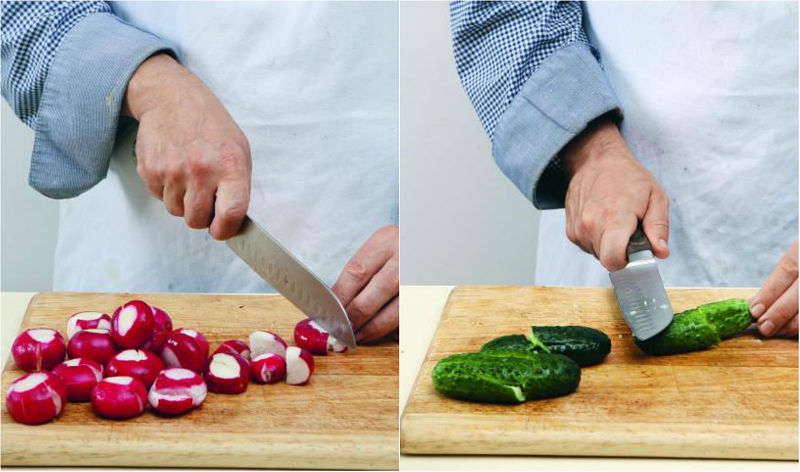 Vajcia uvaríme natvrdo a následne ošúpeme a nakrájame na kúsky. Umyjeme reďkovky a odstránime „chvostíky“ a stonky. Potom ich nakrájame na kúsky. Rovnako narežeme uhorky.