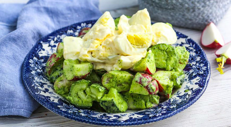 Túto jarnú dobrotu servírujeme ako dvojfarebný šalát. Najprv uložíme zelenú časť z reďkoviek, uhoriek a dresingu. Na ne uložíme vrstvu vajíčok v smotane a podávame. Vynikajúco sa k tomu hodí čerstvý alebo opečený chlebík, či grilované mäsko.