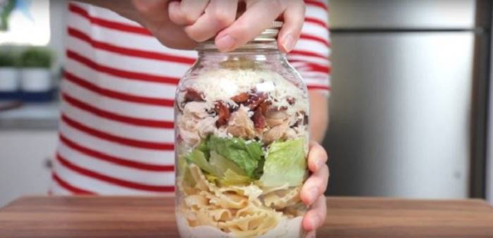Na dno pohára nalejte dresing, naň naukladajte vrstvu cestovín poliatych olivovým olejom, potom nakrájané listy rímskeho šalátu, kuracie mäso a naň slaninku. Vrch zasypte parmezánom. Pred obedom už stačí len potriasť a vychutnávať.