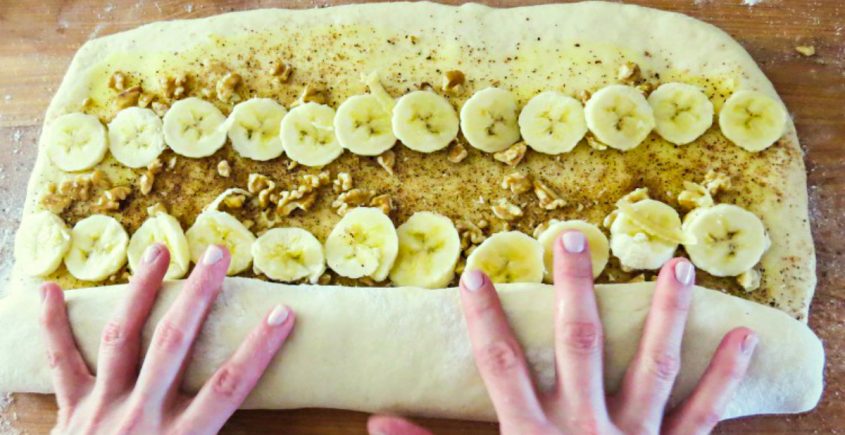 - Rozpustite zvyšné maslo a natrite ho na cesto. Na to nasypte mleté alebo nasekané vlašské orechy a posypte škoricou a ak máte radi aromatické sladkosti, môžete pridať aj štipku rozdrvených klinčekov. Banány si nakrájajte na tenšie kolieska a poukladajte ich na cesto.