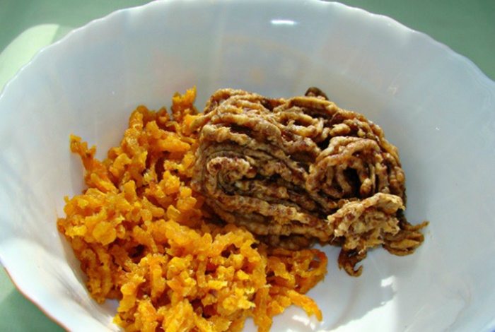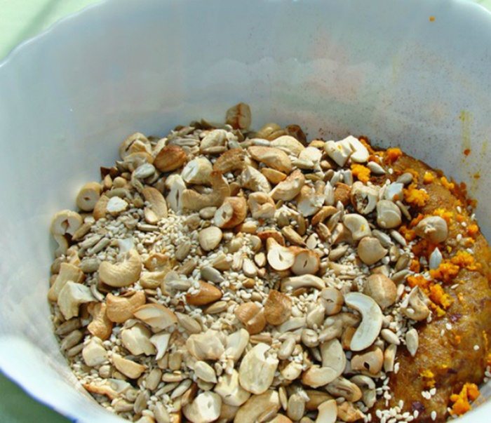 Zalejte ich primeraným množstvom horúcej vody a chvíľočku povarte, aby sa mierne rozvarili. Mala by vám vzniknúť kašovitá konzistencia. Presuňte ju do misky a pridajte k nej kešu oriešky, škoricu, kardamón, slnečnicové semiačka a pomarančovú kôru. Všetko spolu dôkladne premiešajte.