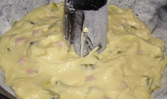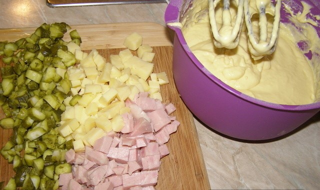 Zavárané uhorky si nakrájame na drobné kocky. Rovnaký postup zvolíme pri šunke a syre. Tieto suroviny následne pridáme do cesta a dôkladne zamiešame lyžicou. Takto pripravené cesto nakoniec osolíme a okoreníme.