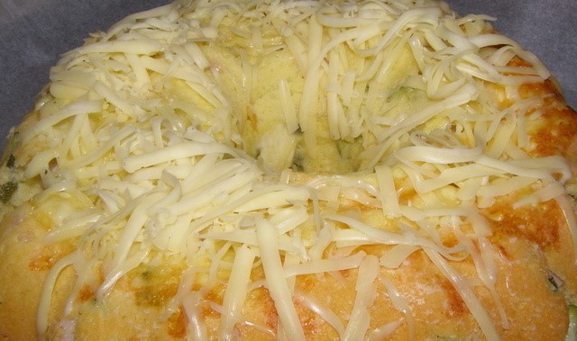 Po pol hodine bábovku vyklopíme z formy a uložíme na plech vystlaný papierom na pečenie. Vrch bábovky posypeme strúhaným syrom a pečieme ďalších 15 minút na rovnakej teplote.