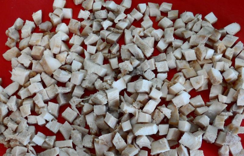 Keď sú prsia hotové, vyberte ich z vody a nechajte vychladnúť. Potom ich nakrájajte na drobné kocky.