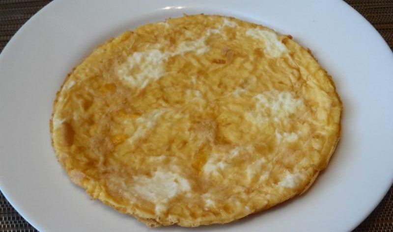 Pripravte si suchú teflónovú panvicu. Zmiešajte bielka a žĺtok a buchnite ich na panvicu. Keď sa vám vajcia spravia, vyberte ich vidličkou. Keď máte všetky tri „palacinky“ hotové, odložte ich nabok a nechajte vychladnúť.