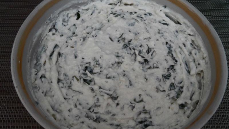 Teraz si pripravte plnku. Nasekajte petržlenovú vňať na drobno. Môžete použiť aj iné bylinky, ktoré máte radi a takisto ich nasekajte od chuti. Niekto má rad výraznejšiu chuť, niekto len jemnú. Pridajte jogurt a tvaroh a dobre premiešajte. Potom pridajte pretlačený cesnak, soľ a korenie a opäť dobre premiešajte.