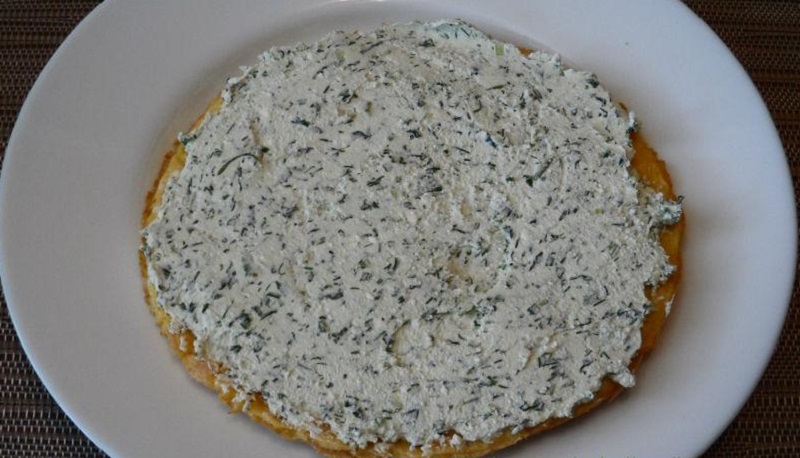 Vezmite si prvú palacinku a natrite na ňu vrstvu tvarohovo-bylinkového krému. Naň potom poukladajte vrstvu mäska. Na mäso zasa položte palacinku a vrstvy opakujte.