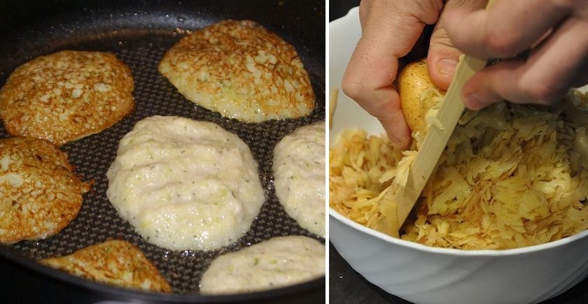 Medzitým si nastrúhajte zemiaky, ak sú mladé, pokojne aj so šupkou, na jemnom strúhadle. Takisto z nich vyžmýkajte prebytočnú šťavu. Cibuľu pokrájajte na drobno, pretlačte cesnak. Nezabudnite zemiaky osoliť a okoreniť a pridajte cuketu. Všetko dobre zamiešajte a potom do zmesi pridajte vajcia a múku. Všetko spolu dobre premiešajte.