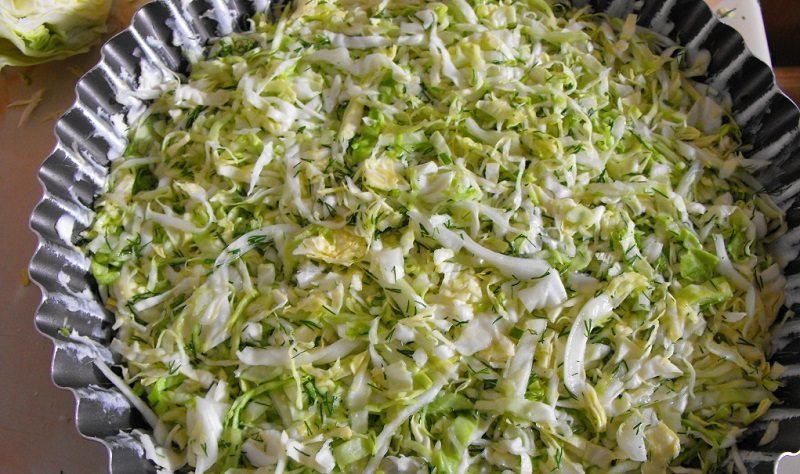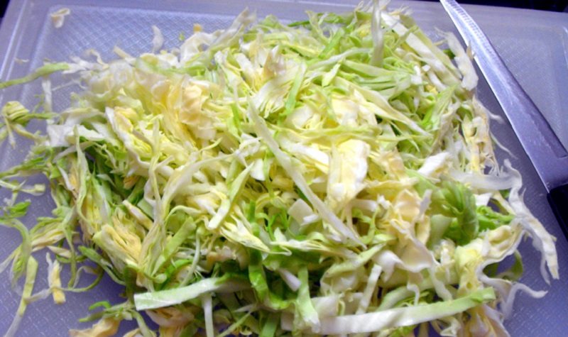 Kapustu nakrájajte na tenké pásiky a zľahka posoľte. Pridajte nasekaný kôpor, alebo petržlenovú vňať a premiešajte.