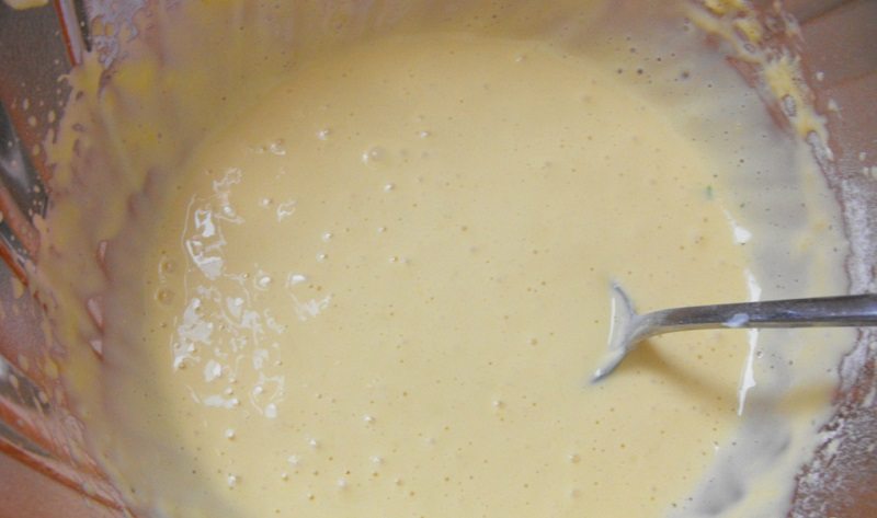 V miske si vyšľahajte celé vajíčka. Do nich dajte kyslú smotanu, majonézu, múku a prášok do pečiva a všetko spolu dobre premiešajte, aby vzniklo jednoliate cesto.