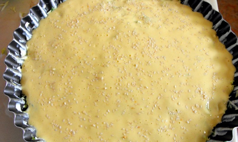 Tortovú formu, alebo menší pekáč si vymastite maslom. Vylejte doň polovicu cesta, naň nasypte všetku kapustu s kôprom a zalejte ju zvyšným cestom.
