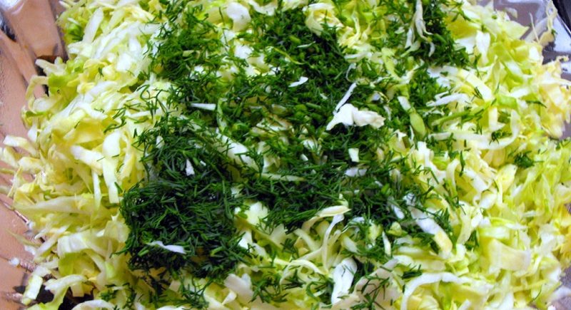 Kapustu nakrájajte na tenké pásiky a zľahka posoľte. Pridajte nasekaný kôpor, alebo petržlenovú vňať a premiešajte.
