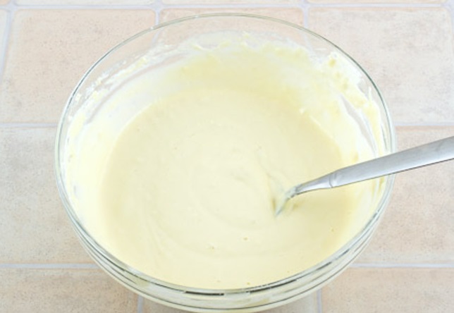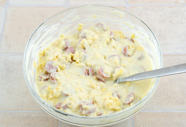 Syr si nastrúhame na hrubom strúhadle, klobásy nakrájame na tenké kolieska. Vajcia, kefír (alebo jogurt), soľ od chuti pomixujeme. Pridáme múku a prášok do pečiva a opäť zamiešame, aby sa nevytvorili hrudky.