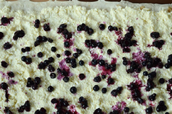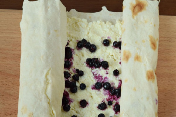 Pita chlieb si rozložte a tvarohovú zmes naň rovnomerne rozotrite. Pridajte ovocie, ktoré máte najradšej (osvedčili sa najmä čučoriedky a čerešne).