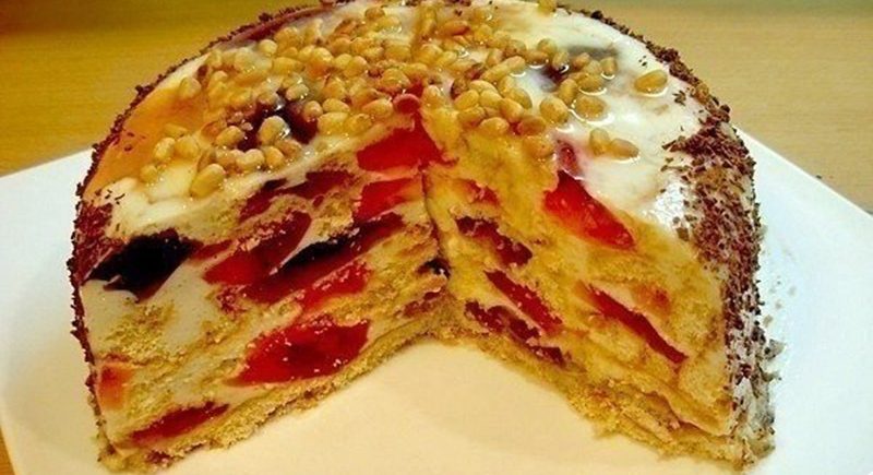 V mise si zmiešame tvaroh, kyslú smotanu, sušené ovocie a práškový cukor. Pridáme zmäknuté maslo a dôkladne, no opatrne premiešame. Zmes si rozdelíme tak, aby nám z nej vyšli približne 4 alebo 5 vrstiev v tortovej forme. Sušienky poukladáme na dno tortovej formy a na ne dáme vrstvu tvarohovej zmesi. Opäť naukladáme sušienky a vrstvíme zmes. Postup opakujeme až pokým neminieme celú tvarohovú zmes. Navrch nasypeme sekané, alebo celé orechy. Dáme zachladiť aspoň na 4-5 hodín do chladničky a môžeme podávať.