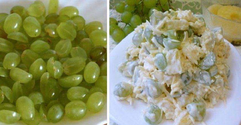Hrozno umyte a bobuľky nakrájajte na polovice. Ak sú ananásové kocky veľké, prekrojte aj tie na menšie kúsky. Syr postrúhajte na jemnom strúhadle. Kuracie mäso si narežte na kocky a pripravte ho len na olivovom oleji, soli a korení, nič viac. Chuť musí byť celkom jednoduchá. Nechajte ho vychladnúť. Všetky ingrediencie dajte do veľkej misky a zalejte bielym jogurtom, alebo smotanou. Osoľte a okoreňte, kto chce môže pridať kvapku kremžskej horčice. Na záver pretlačte strúčik cesnaku a všetko dobre premiešajte. Prajeme dobrú chuť!