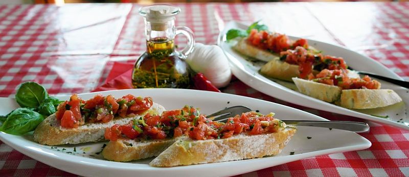 Nakrájaný chlieb potrieme troškou olivového oleja a opečieme z oboch strán na suchej panvici. Následne ho ešte teplý potrieme cesnakom. Na jednotlivé bruschetty potom dáme zmes, ktorú sme si pripravili z nakrájaných paradajok, nakrájanej bazalky, cesnaku a citrónovej šťavy. Osolená a dobre premiešaná zmes by mala byť pripravená asi 15 až 20 minút pred podávaním. Na záver môžeme zmes na bruschette pokvapkať olivovým olejom a pridať nastrúhaný parmezán. Tento pokrm je typické talianske predjedlo a symbolizuje všetky tri farby talianskej vlajky.