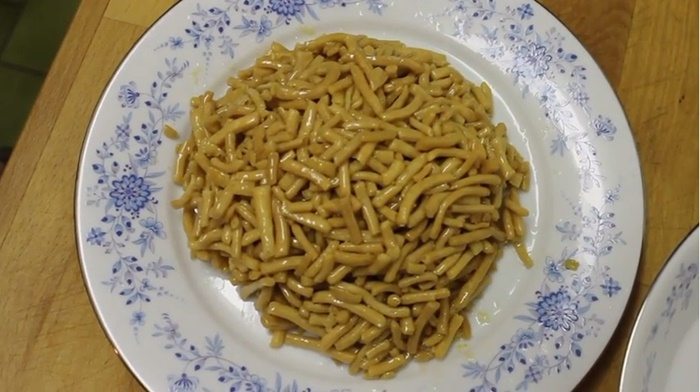 Cesto rozvaľkajte na hrúbku zhruba 0,5cm a nakrájajte rozdeľte na pásy široké zhruba 5mm. Samotné pásy potom nakrájajte ešte priečne na malé pásiky. Takto vám vznikne niečo ako mini rezance.
