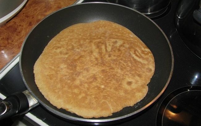 Toto cesto potom rozdelíme na 8 rovnakých častí. Rozohrejeme si panvicu a z jednotlivých častí cesta vyvaľkáme kruh o priemere panvice. Cesto potom kladieme na horúcu panvicu a pečieme z každej strany na sucho približne jednu minútu. Suchšie časti na každej „palacinke“ odstráňte nožom ale nevyhadzujte! Tieto omrvinky použijete na posypanie a ozdobenie torty. Panvicu po pečení každej placky pretrite, aby na nej neostávala pripálená múka.