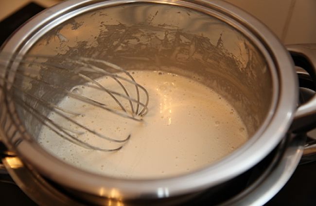 Na prípravu krému použijeme zvyšok múky (štvrť hrnčeka), ktorú zmiešame s cukrom. Vajíčka vymiešame v mlieku a pridáme k múke. Potom pridáme vanilku. Túto zmes miešame v hrnci na miernom plameni (radšej menší ako silný plameň). Postupne nám bude tuhnúť na hustejší puding.