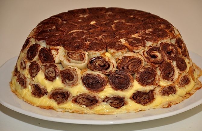 Zmiešaním a vyšľahaním všetkých surovín si pripravte palacinkové cesto a palacinky smažte na panvici s olejom. Hotové palacinky posypte kakaovým práškom a zrolujte. Zapekaciu misku si vymastite maslom, palacinky ešte nechajte bokom.