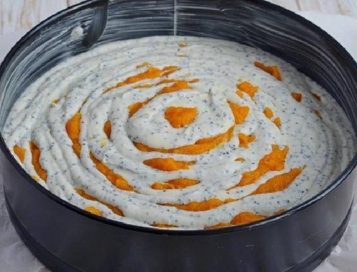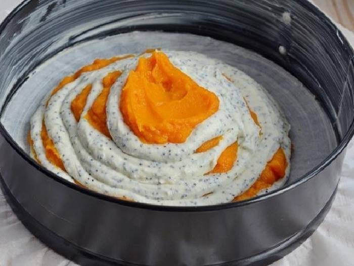 Tortovú formu si vyložte papierom na pečenie. Teraz striedavo nakladajte vrstvu makovo-tvarohovej zmesi a vrstvu tekvicovej zmesi. Tortovú formu potom trochu potraste, aby sa zmes rovnomerne rozložila. Dajte tortu piecť do rúry vyhriatej na 170 stupňov a pečte ju 40 minút.