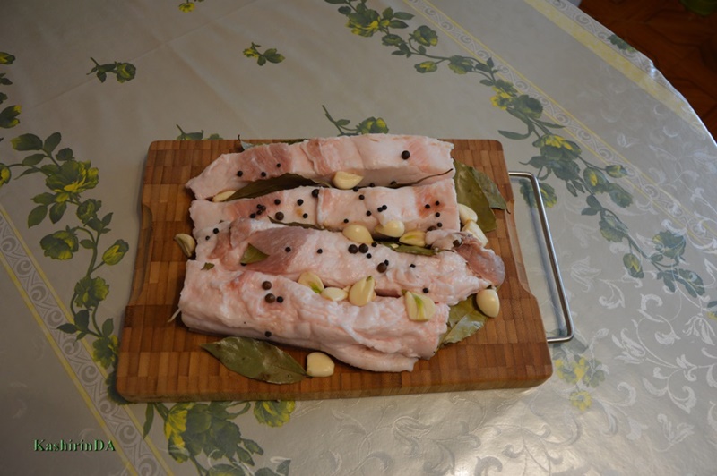 Naukladajte doň slaninu nakrájanú alebo narezanú na ľubovoľné kusy. Medzi slaninu pravidelne vkladajte aj bobkový list, aby sa jeho chuť rozložila do celého objemu pohára, nie len v jednom mieste. Tak isto pretláčajte cesnak. Kto má rád kúsky cesnaku, nemusí ho pretláčať, stačí ho pokrájať na tenké plátky a vkladať spolu s bobkovým listom medzi slaninu.
