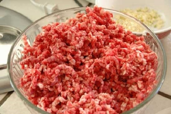 Hovädzie i bravčové mäso si pomelieme na mlynčeku. Cibuľu nakrájame na malé kúsky a primiešame k mäsu. Pridáme soľ, čierne korenie a červenú papriku a všetko dobre premiešame. takto pripravenú zmes uložíme na chvíľu do chladničky a zatiaľ si pripravíme cesto.