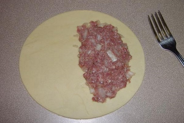 Každý kúsok cesta vyvaľkáme do kruhu s priemerom približne 20 cm. Následne na polovicu kruhu uložíme mleté mäso, ktoré sme si vopred pripravili. Náplň z mäsa neukladáme až po okraj, aby sme cesto mohli neskôr zlepiť.