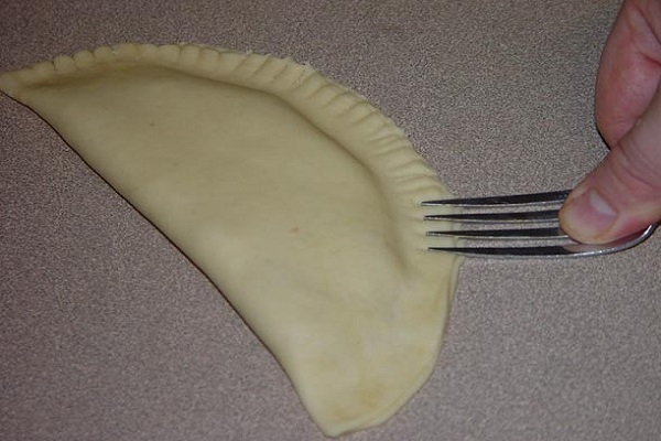 Cesto preložíme na polovicu a okraje jemne pritlačíme prstami. Potom vezmeme vidličku a dôkladne ňou cesto zlepíme po celom jeho okraji tak, ako vidíme na obrázku.