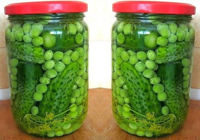 Zaváraninové poháre si vysterilizujte a na ich dno poukladajte v rovnakom diele kôpor a cesnak nakrájaný na plátky. Potom doň naukladajte uhorky, ale len toľko, aby sa ešte zmestil hrášok, ktorým ich zasypete.