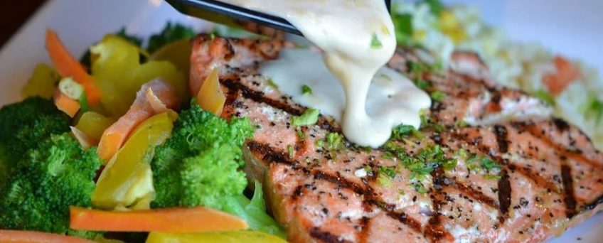 Grilovaný losos so zemiakovou kašou a omáčkou