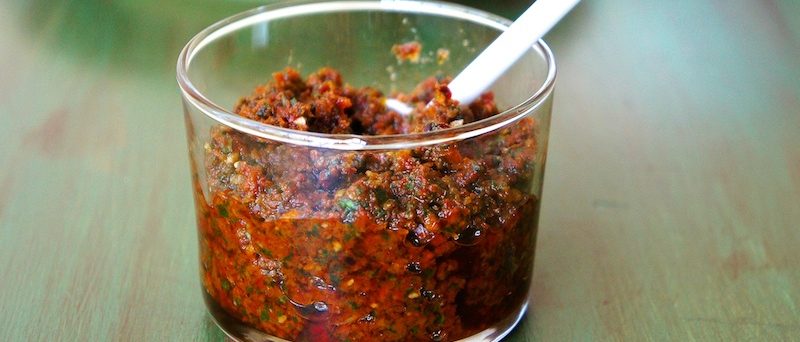 Budeme potrebovať: sušené paradajky v oleji cesnak vlašské orechy soľ a korenie Postup: Pripravíme si sušené paradajky v oleji (aj s olejom), malý strúčik cesnaku, trochu vlašských orechov, soľ a korenie. Zmes znovu mixujeme, až kým nám nevznikne požadovaná konzistencia. Toto pesto je skvelé, ak chcete vymyslieť napríklad niečo nové na chuťovky pre návštevu. Ak vás už nebavia