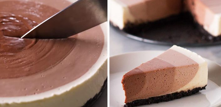 Tripple cheesecake, alebo hombre cheesecake. Akokoľvek ho nazveme, pohľad naň je udivujúci a priam fascinujúci. Naoko sa môže zdať náročné vytvoriť takýto cukrársky skvost, no keď si prečítate postup, budete ho utekať spraviť aj vy. Budete potrebovať: 24 kúskov plnených čokoládových sušienok (môžu byť Oreo) 60g masla 230g mascarpone 150 g kryštálového cukru 1 balíček vanilkového